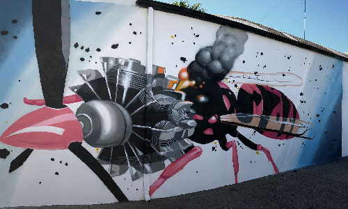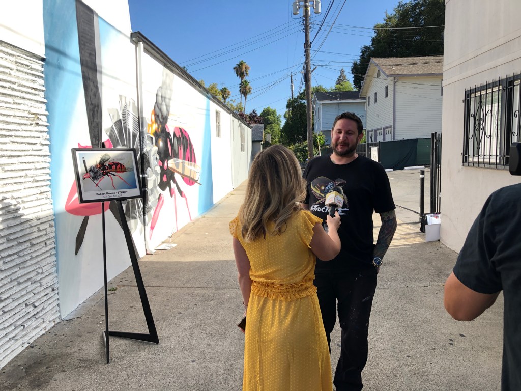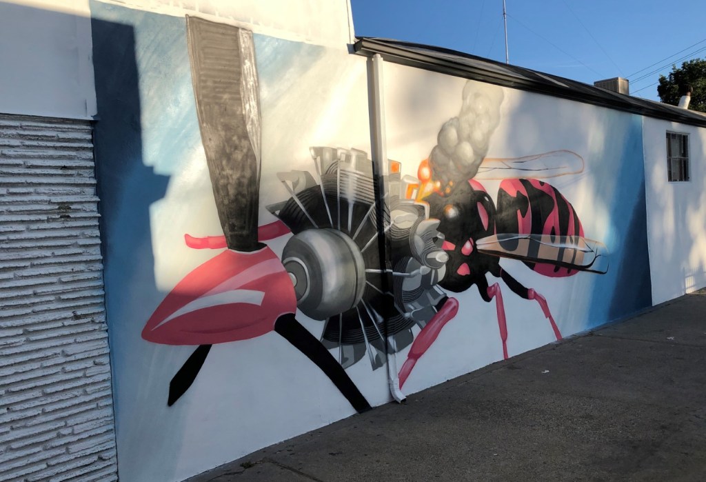 STING by Robert Bowen is located in Sacramento Mural Alley at 3223 Folsom Boulevard in East Sacramento. This installation is part of the Archival Gallery building and is the first mural visible from Folsom Boulevard.